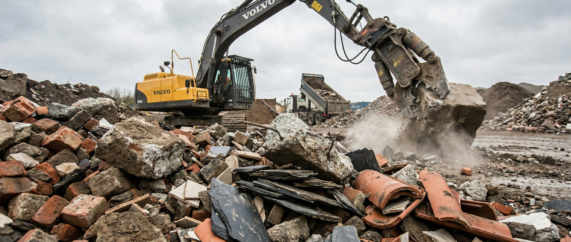 Diese Materialien werden auf unserem Betriebsgelände angeliefert, gesichtet und sortiert. Da sie wertvolle Rohstoffe enthalten, bereiten wir sie für die weitere Nutzung auf. Falls nötig, erfolgt in einem ersten Schritt die Vorzerkleinerung mithilfe eines Betonknackers.